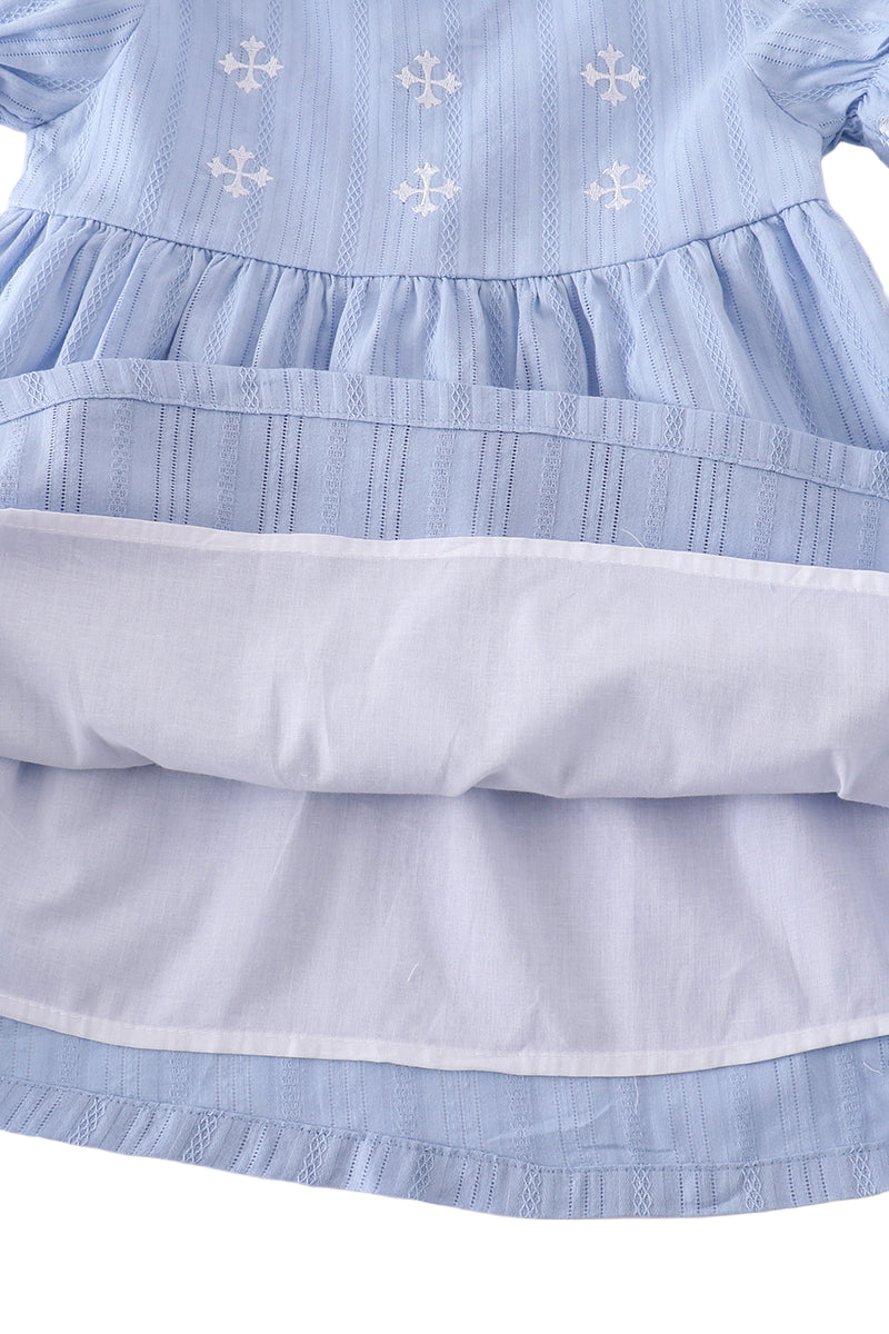 Crafted for the stylish child, this dress merges understated elegance with delightful charm. Intricate blue cross embroidery adorns the fabric, adding a distinctive artistic touch that catches the eye. The clean silhouette ensures versatility, making it perfect for both everyday wear and special occasions.